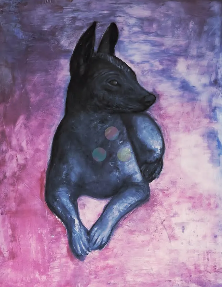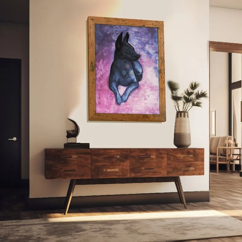 Entre velos de azul, violeta y rojo que se disuelven como recuerdos en el aire, reposa la silueta negra de un perro que mira hacia la izquierda, quizá hacia el pasado, quizá hacia lo invisible. Su quietud contiene un universo de lealtad y silencio, una presencia que acompaña sin decir, que observa sin juzgar.