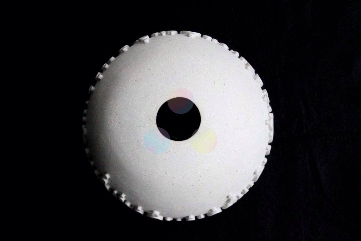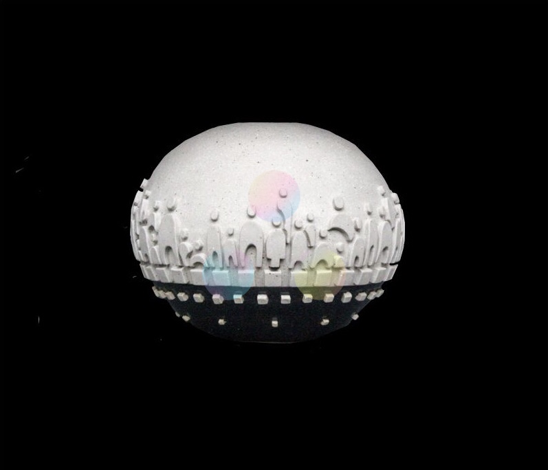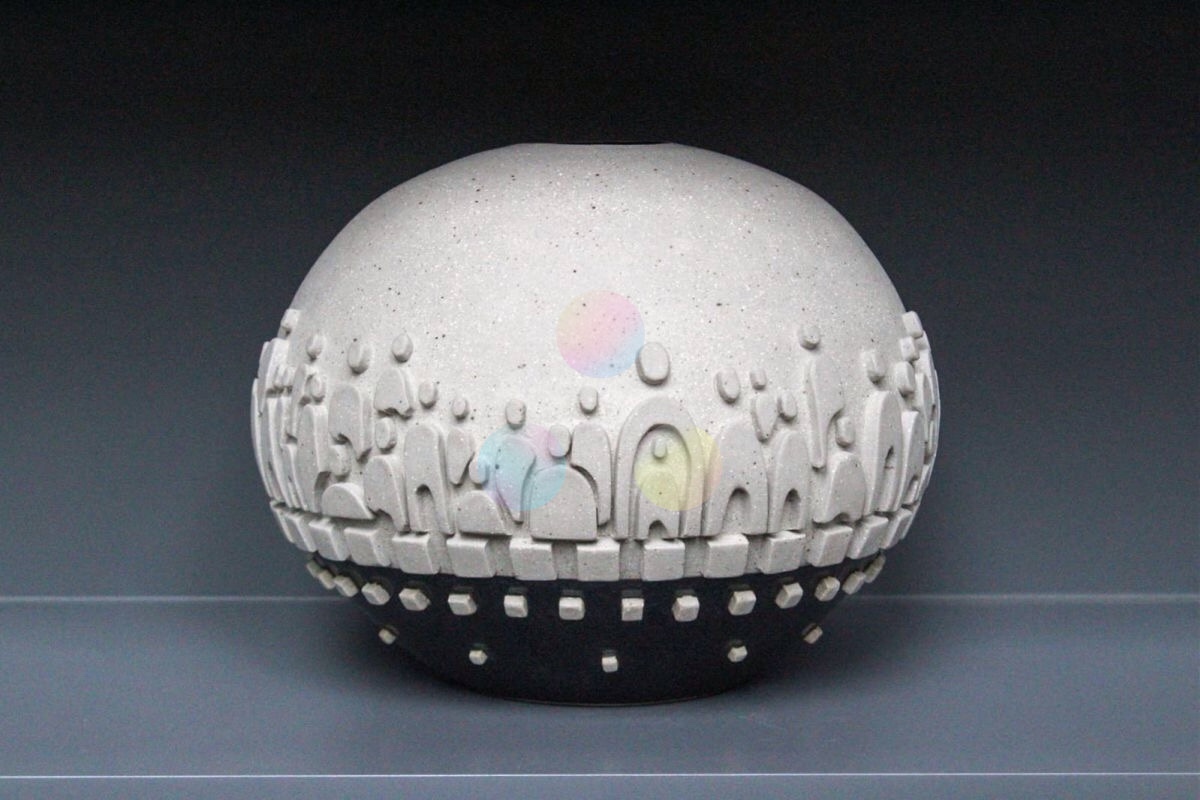 La obra “Gente alrededor del mundo” es una escultura de forma ovalada realizada en cerámica de alta temperatura, en la que la autora—arquitecta de formación—explora las relaciones humanas desde una mirada universal y esencialmente arquitectónica. La superficie de la pieza está poblada por siluetas humanas en relieve, inspiradas en las figuras esquemáticas que comúnmente se utilizan en el dibujo arquitectónico como medida de escala y representación del cuerpo en el espacio.