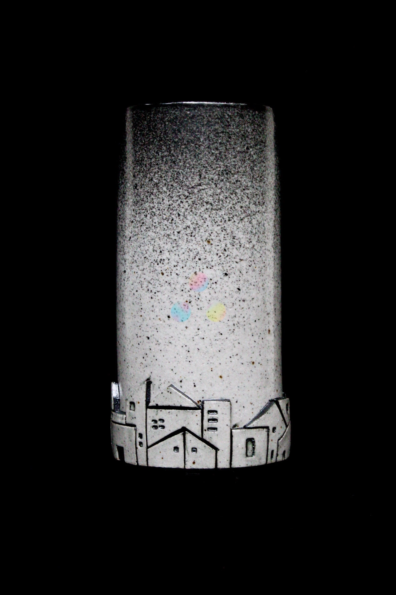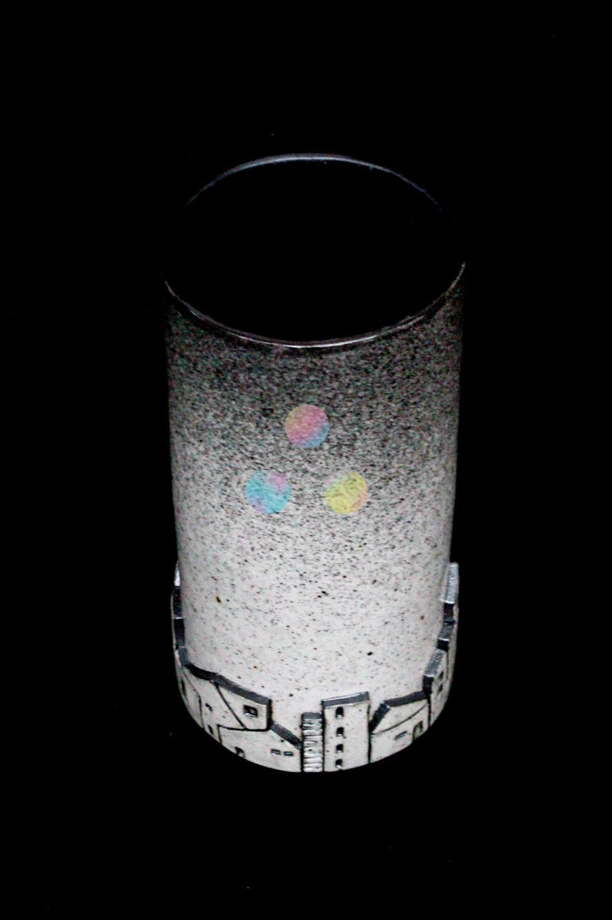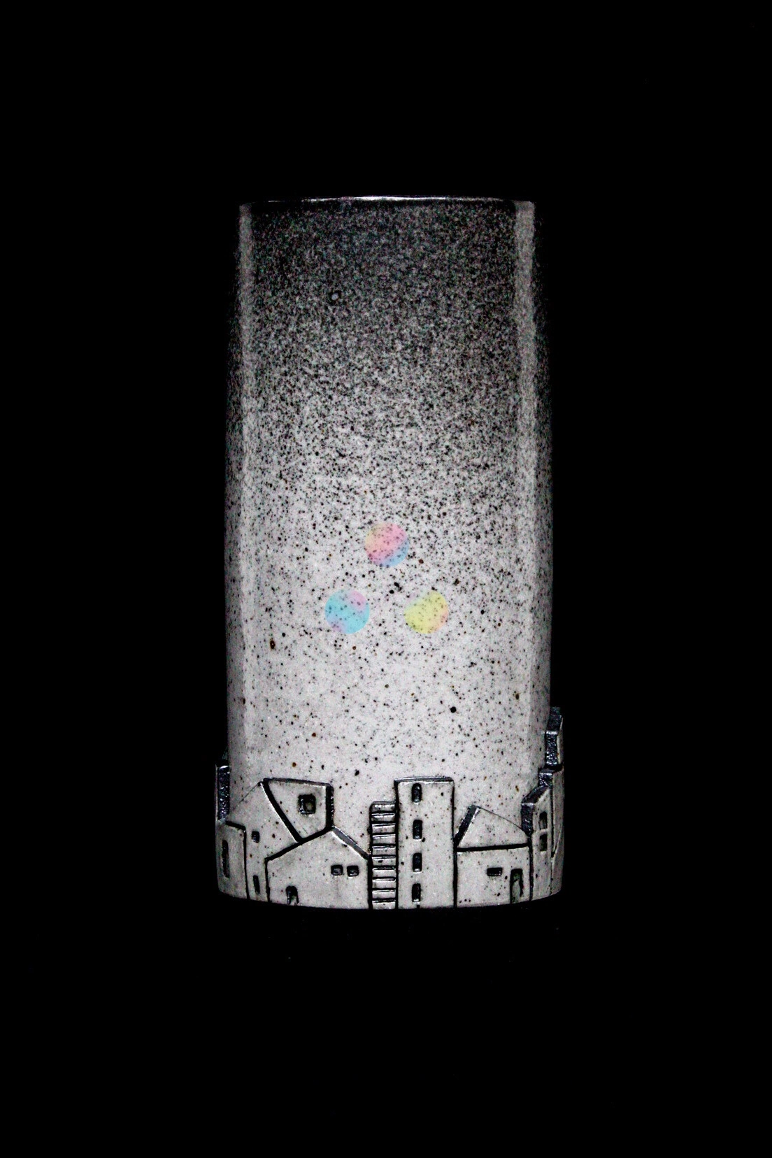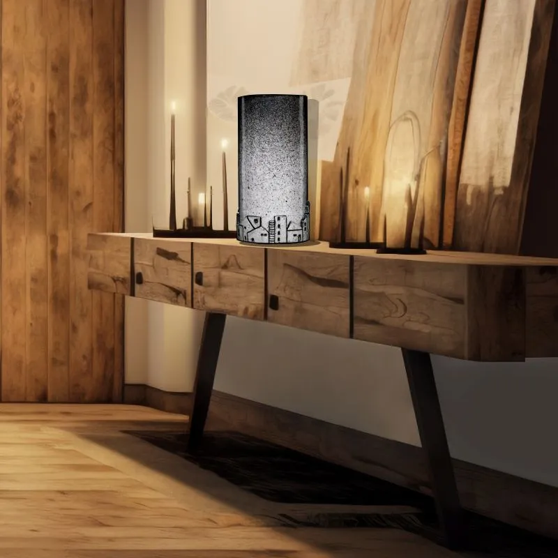 El tratamiento del esmalte —que transita desde tonos claros hacia una textura oscura y moteada— sugiere el paso de la luz a la sombra, el ascenso del horizonte hacia el cielo profundo. En el centro, sutiles toques de color introducen un contraste delicado, como destellos de estrellas o reflejos de la luna sobre los tejados.